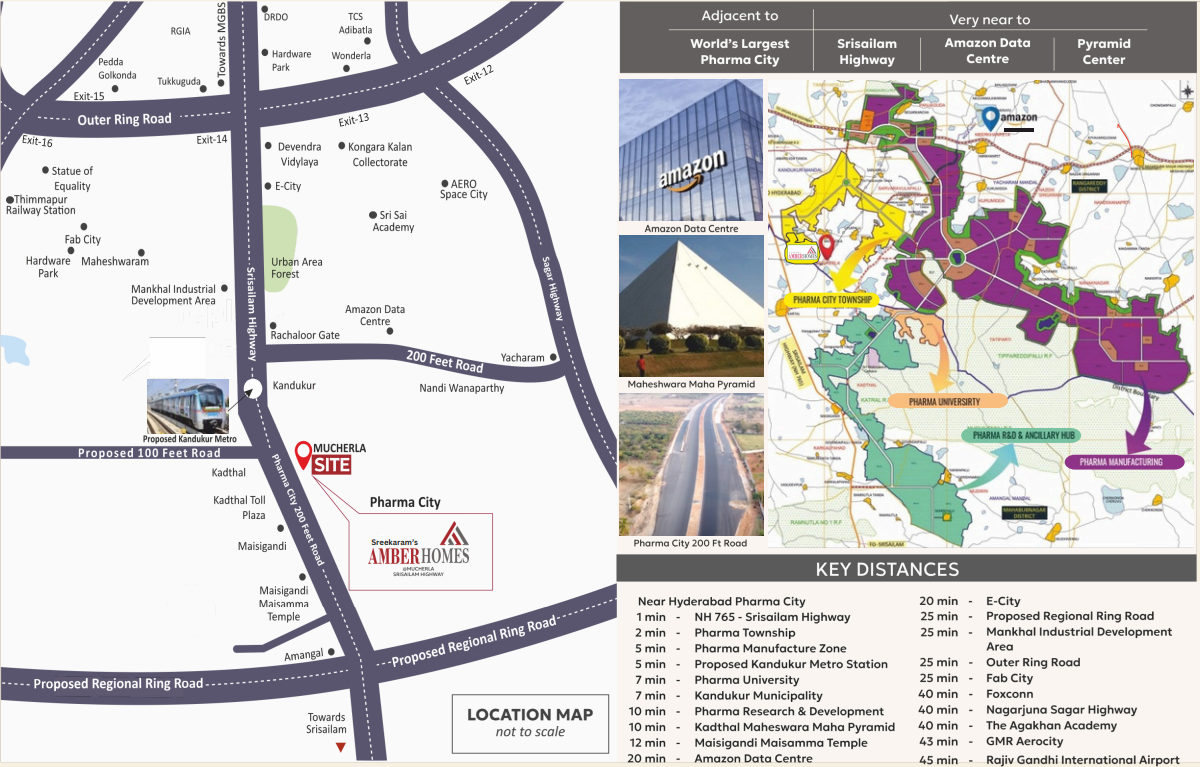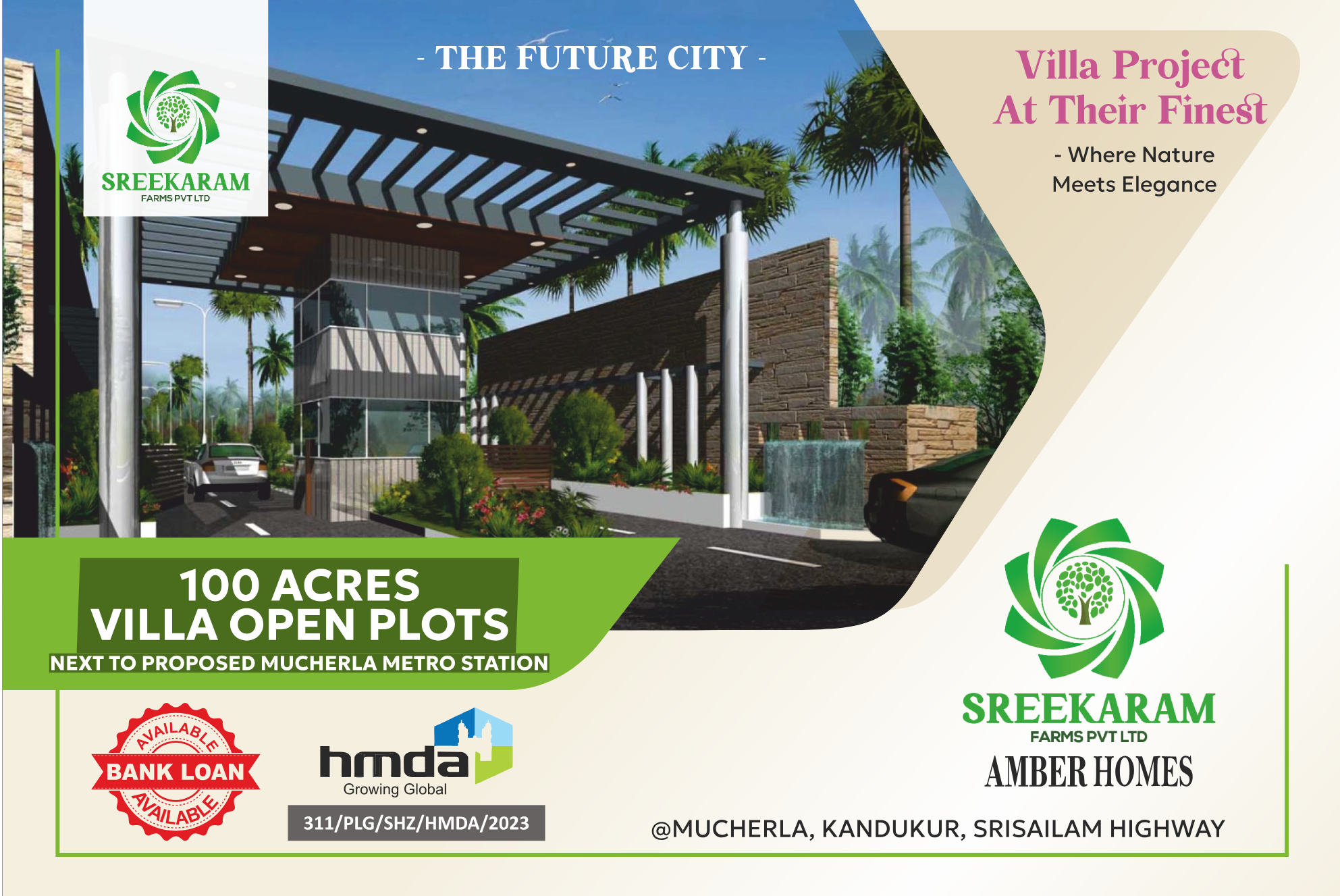 Our project is strategically located on the Srisailam Highway at Mucherla, in the heart of Telangana's newly announced Future City. This ambitious development, envisioned as the fourth city after Hyderabad, Cyberabad, and Secunderabad, will soon feature a Skills University, AI Hub, Health City, and a worldclass stadium. Spanning across a vast area, the project is designed to become a thriving residential and commercial hub, offering a balanced mix of urban convenience and green, open spaces.
